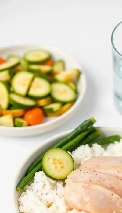 Обед (13:00): Куриная грудка, приготовленная на пару, с белым рисом и тушеными кабачками. Бульон из курицы (нежирный). Стакан воды.