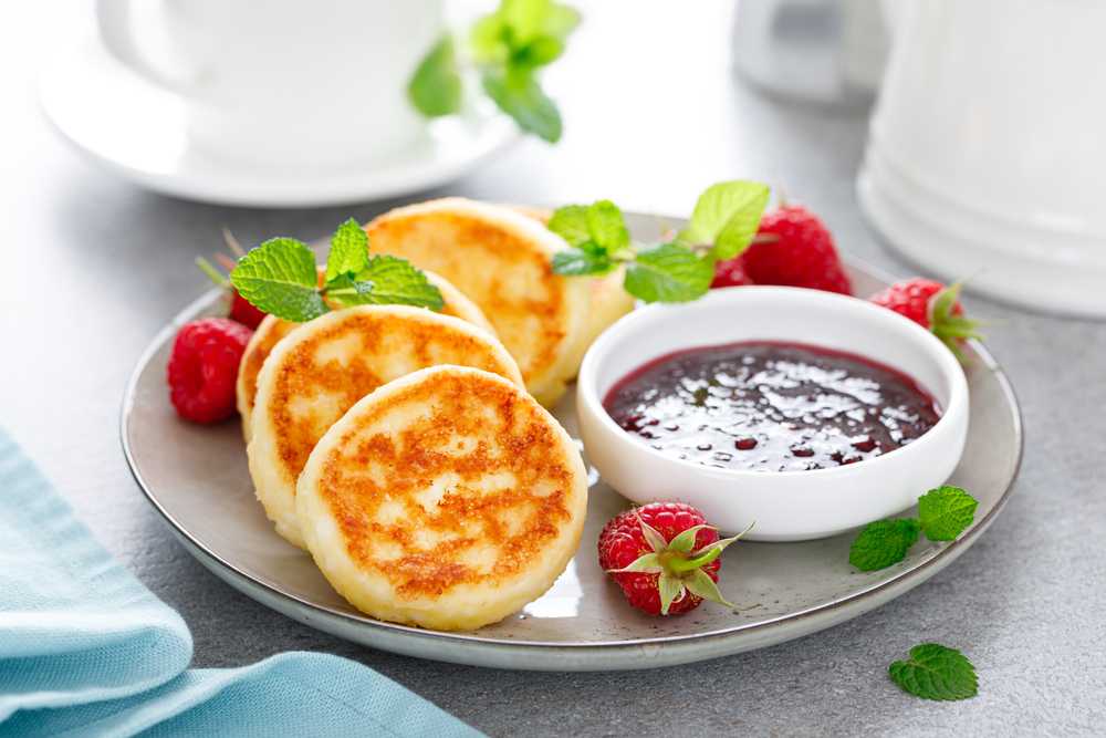 Завтрак: сырники с ягодным джемом, некрепкий кофе с молоком.