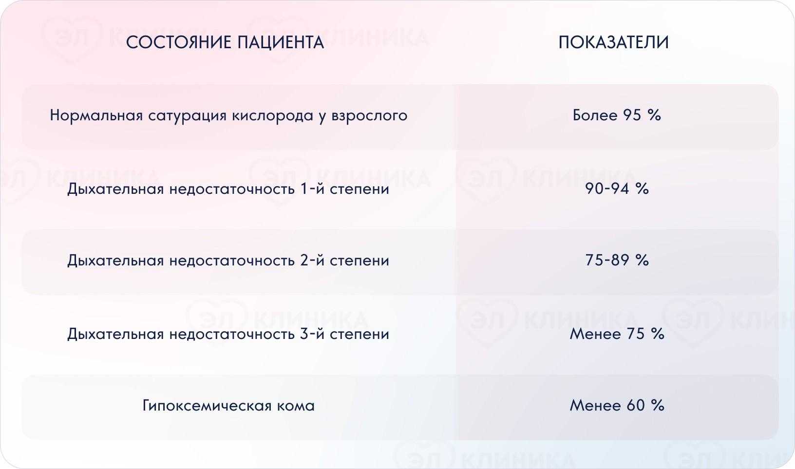 Какая норма сатурации у взрослых таблица