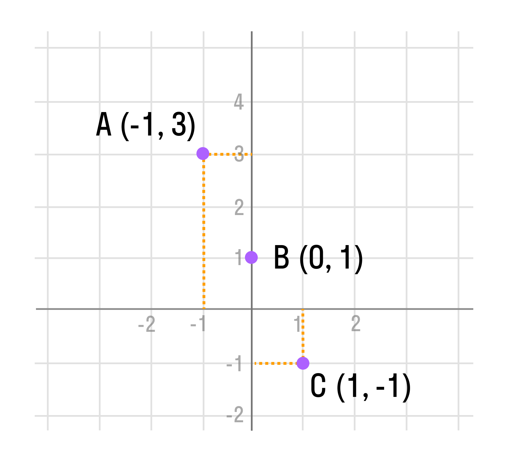 3. Отметим точки А (-1; 3), B (0; 1) и С (1; -1) на прямоугольной системе координат.
