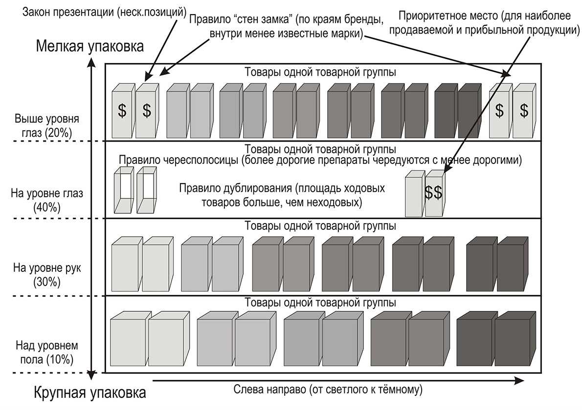При создании планограмм используют различные принципы расположения товара в торговой точке: