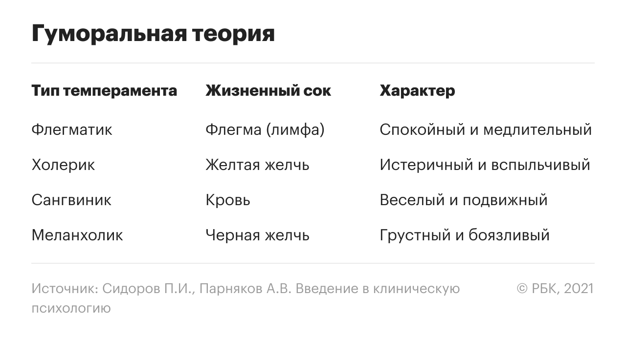 Считается, что разделить людей по типам темперамента предложил Гиппократ в книге «О природе человека» в V веке до нашей эры. Теория основывалась на представлении, что в теле текут четыре «жизненных сока» — кровь, флегма (лимфа), желчь и черная желчь. Доминирование одной из жидкостей могло вызвать болезни и влияло на характер человека. При этом комбинация соков зависит от комбинации звезд в момент рождения.