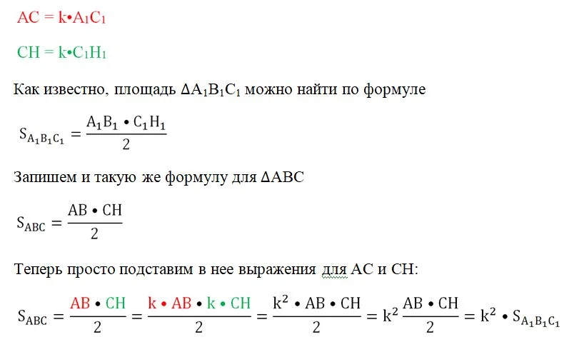 А каким будет отношение площадей подобных треугольников?Оказывается, что они отличаются уже в k2 раз. Докажем это.