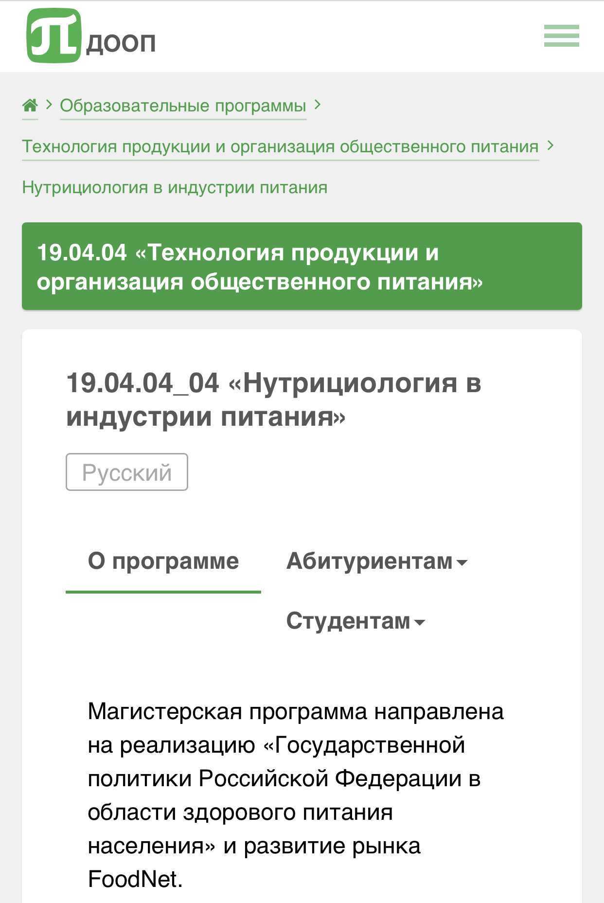 1. Учебное заведение: Политех (Институт биомедицинских систем и биотехнологий)Программа: «Нутрициология в индустрии питания»Особенности: Это магистерская программа со вступительными экзаменами для тех, кто хочет работает в сфере пищевых технологий, с продуктами и рационами.Срок: 2,5 годаСтоимость: 88 000 рублейФормат: очно и заочно (Санкт-Петербург)Что выдают по окончанию обучения: диплом с профессией «технолог-нутрициолог»
