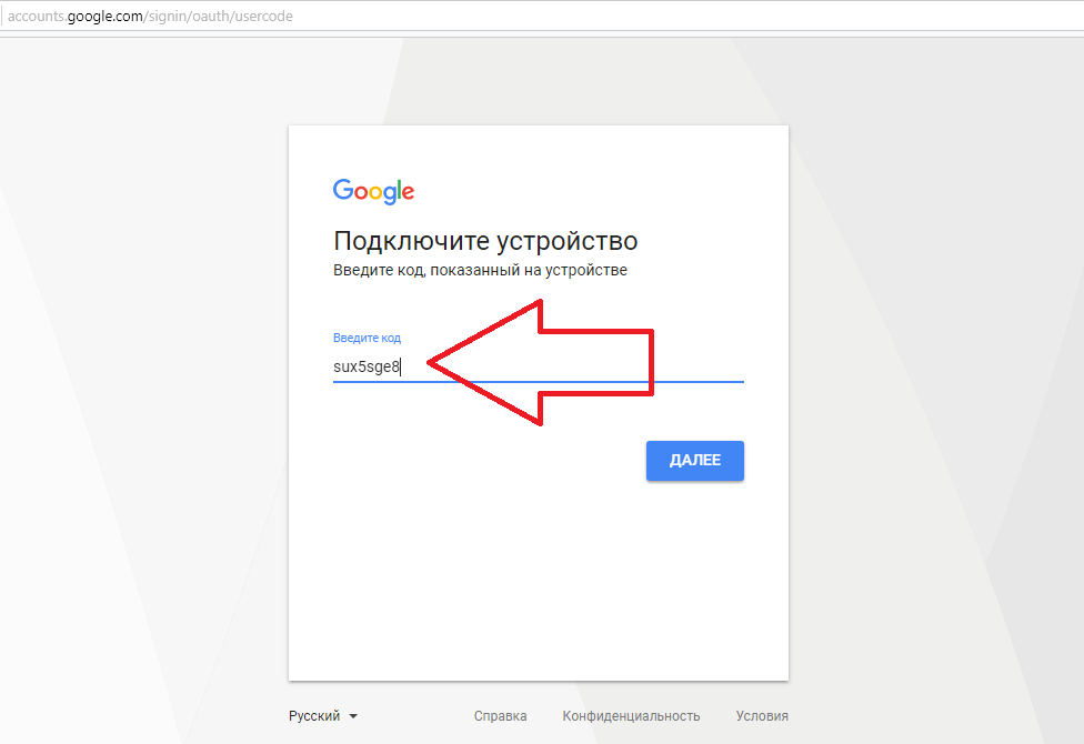 - В открывшемся окне появится окно новой службы YouTube.com/pair. В нем нужно ввести полученный ранее код доступа.
