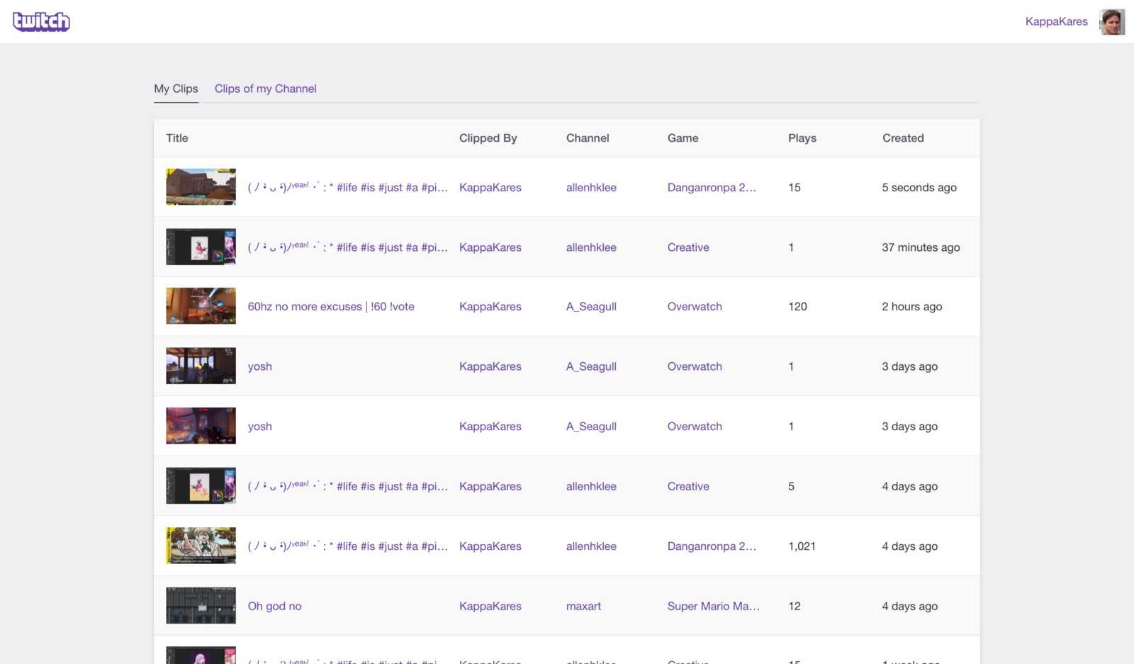 Здесь ничего сложного нет. Просто перейдите в панель управления аккаунтом, которая находится в левом углу экрана, и найдите там соответствующий раздел (“Клипы”). В появившемся окне будет вся подборка ранее сделанных хайлайтов и информация по ним – день, месяц и год, когда была сделана запись, канал запечатленного в клипе стримера, продолжительность записи и категория, к которой она относится. Там же можно сразу же посмотреть этот момент, нажав Play на встроенном проигрывателе.