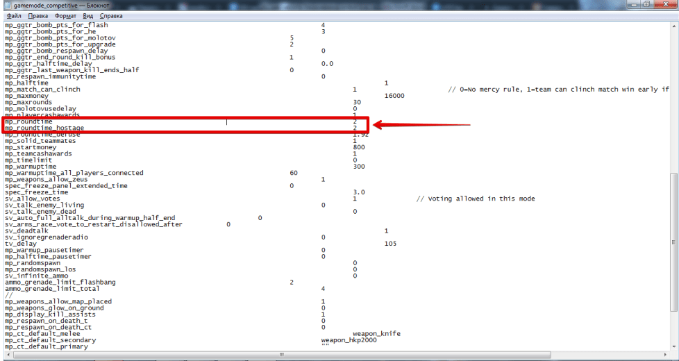 Для этого нужно о ткрыть файл конфигурации « gamemode_competitive.cfg », который расположен по адресу – C:\Program Files (x86)\Counter-Strike Global Offensive\csgo\cfg\. Затем его необходимо открыть и найти надписи: « mp_roundtime 2» и «mp_roundtime_hostage 2». Эти цифры указаны по умолчанию и устанавливают длительность раунда в минутах.