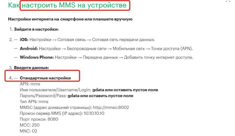 Осуществляется настройка на разных устройствах с разными параметрами – если не получается ввести самостоятельно, то можно запросить данные у оператора (приходят в виде сообщения конфигурации). Сделать запрос настроек для телефона можно быстро, если отправить сообщение на 5049, указав в поле «1».