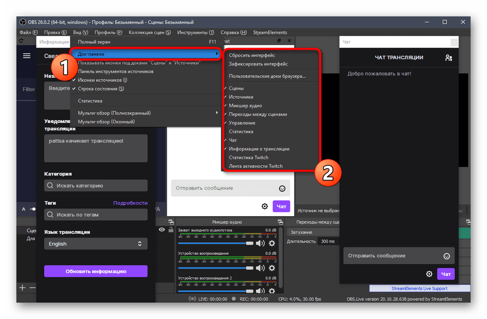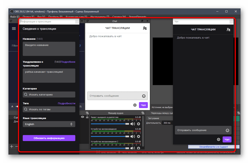В основном окне OBS теперь появятся еще два окна: с информацией о трансляции и чатом. Если второе можно сразу закрыть, то первое пригодится для удобной настройки потока перед запуском.
