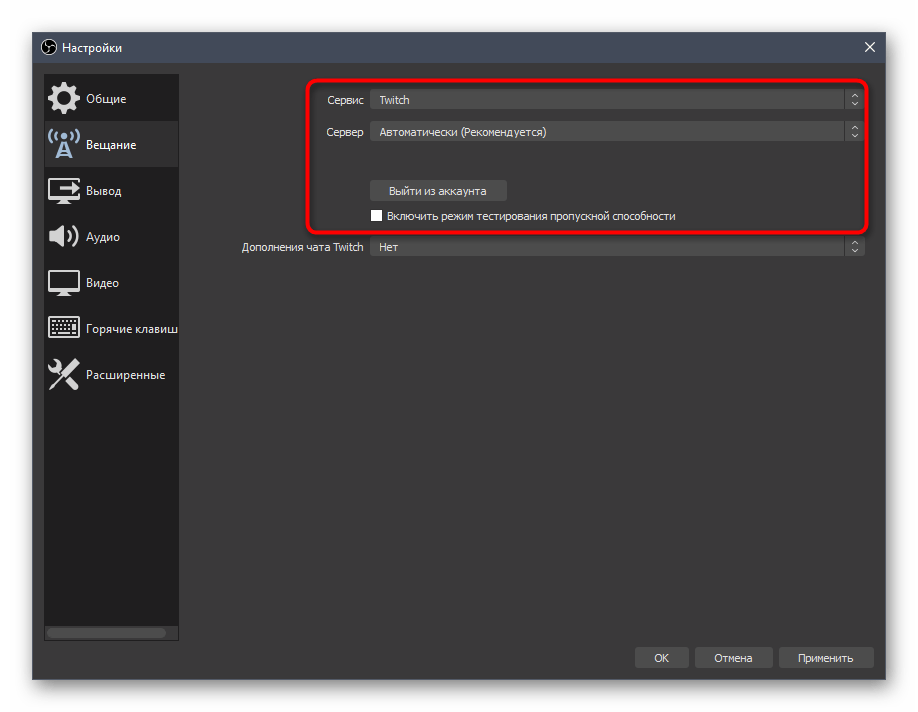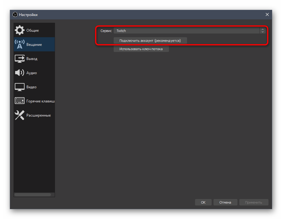 Если вы ранее уже хотели организовать свой стрим или смотрели уроки по этой процедуре, наверняка знаете о том, что для подключения аккаунта в OBS приходилось открывать настройки, получать ключ трансляции, привязывать его и выполнять еще несколько других действий. С установкой StreamElements все становится проще, поскольку аккаунт уже подключен, и остается только выбрать тип вещания в параметрах самой программы.