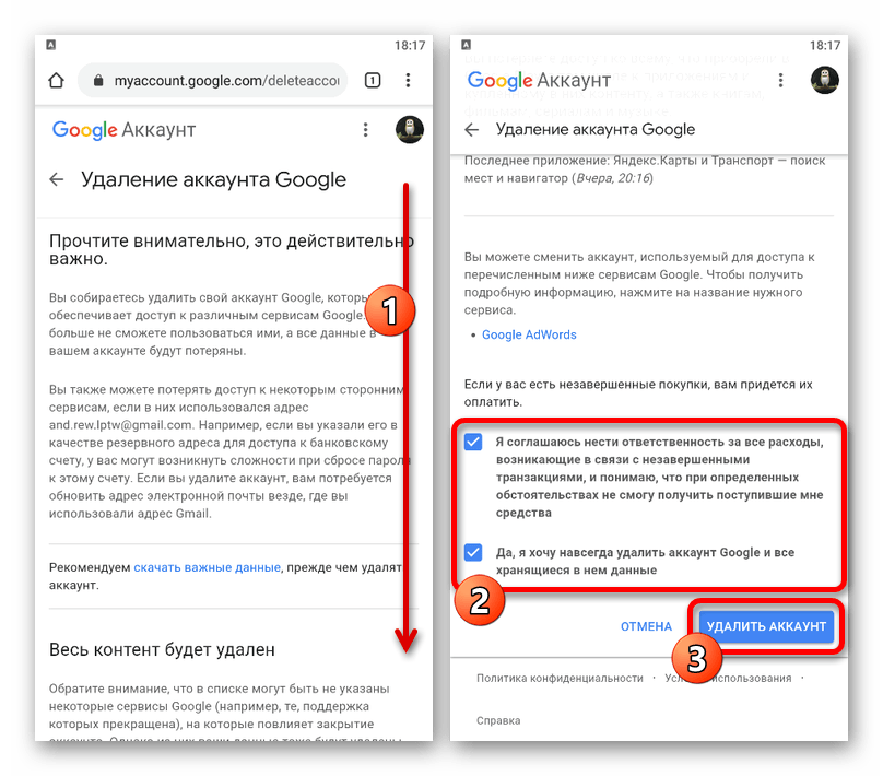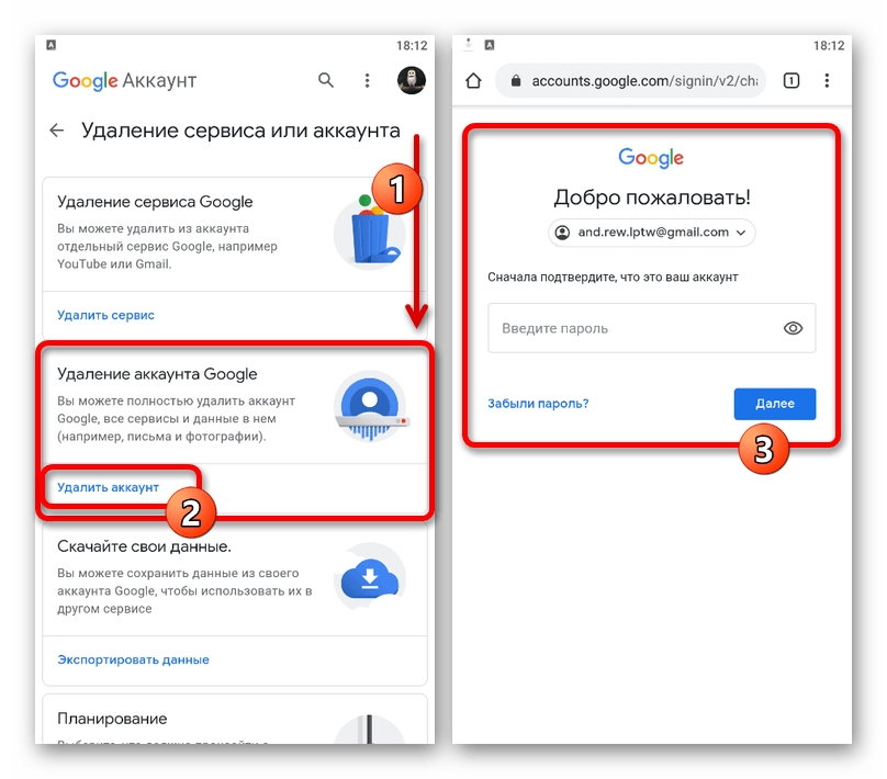 Пролистайте страницу до блока «Скачивание, удаление и планирование» и выберите «Удаление сервиса и аккаунта». Здесь нужно коснуться ссылки «Удалить аккаунт» в подразделе «Удаление аккаунта Google».