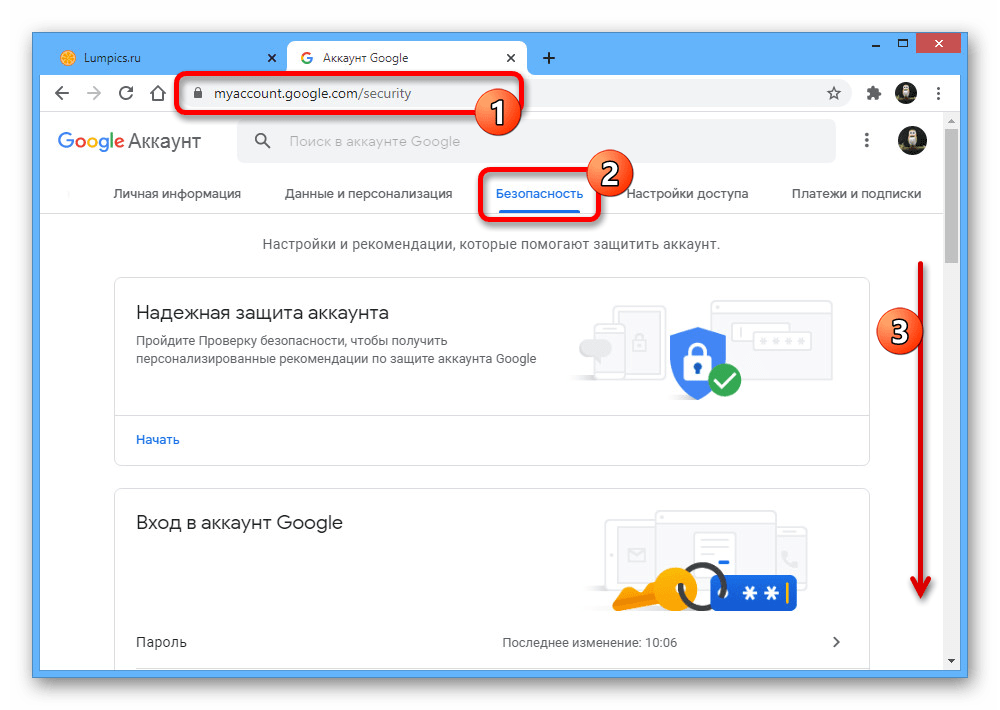 - Воспользуйтесь представленной выше ссылкой, чтобы открыть главную страницу с параметрами учетной записи, и переключитесь на вкладку «Безопасность».