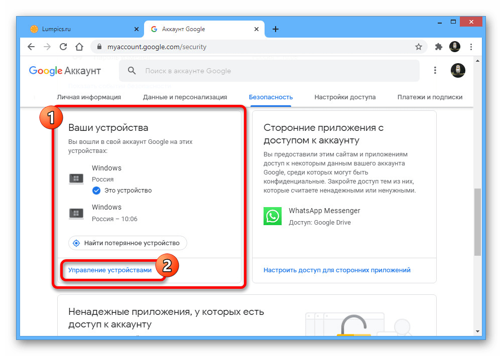 Пролистайте данный раздел до блока «Ваши устройства» и в нижней части нажмите кнопку «Управление устройствами». Также можете сразу отсюда выбрать одно из двух последних устройств.