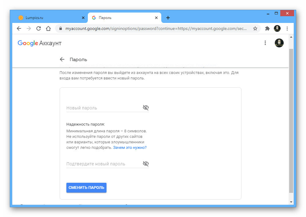 Наиболее простой и вместе с тем единственный доступный на сегодняшний день метод выхода из Гугл-аккаунта сразу на всех гаджетах заключается в смене действующего пароля. Для этого необходимо посетить параметры учетной записи и на вкладке «Безопасность» в разделе «Пароли» внести нужные изменения, подробно описанные нами в отдельной статье.
