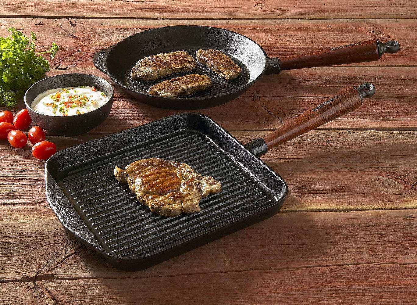 Присутствуют специальные полоски, которые помогают придать стейку привлекательный внешний вид. К чугуну ничего не пригорает, если сковородку правильно использовать. Продукция полностью безопасна для человека, так как не выделяет никаких вредных веществ.