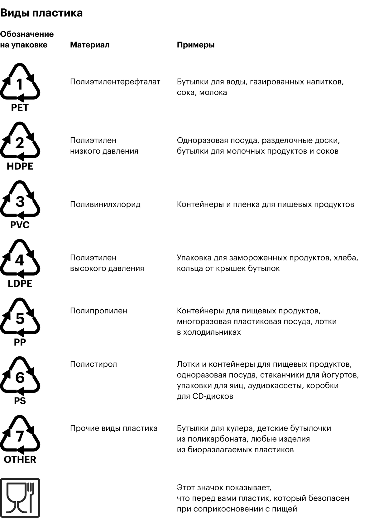 Пластик бывает техническим и пищевым. Хранить еду в техническом не стоит: он для этого не предназначен. Понять, что перед нами пищевой пластик, можно по стандартному значку с бокалом и вилкой в квадрате.