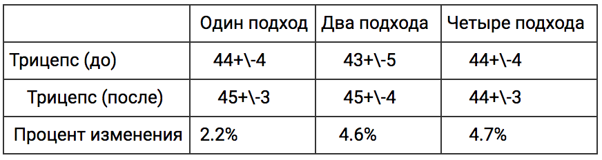 И только трицепс не показал здесь связи «доза – ответная реакция» – в группе с одним подходом и в группе с тремя подходами рост был одинаковым