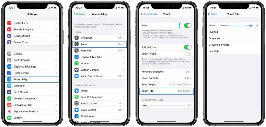 Есть еще одна функция универсального доступа, которая может вызвать проблему с затемненным экраном iPhone 12. Это найдено в Настройки -> Специальные возможности -> Масштаб. Нажмите на фильтр масштабирования и, если он установлен на ‘Приглушенный свет’, переключитесь на ‘Никто’!