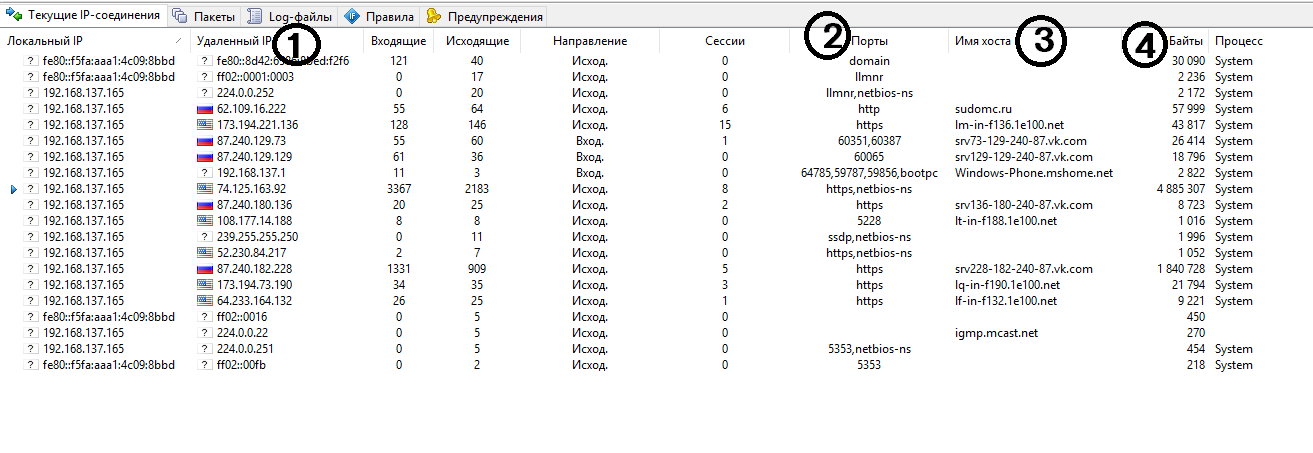 Окей, что делаем теперь? Пользуемся интернетом в вашем обычном режиме. Программу можете свернуть. Через некоторое время посмотрим во владку «Текущие IP-соединения». Там увидим подробную статистку наших соединений — не только то, что вы открываете в браузере, а вообще все, которые установлены между вашим ноутбуком и сетью.
