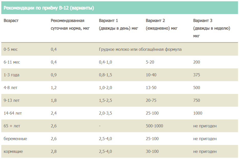 * эти рекомендации касаются цианокобаламинной формы В-12, которая встречается в обогащённых продуктах и большинстве пищевых добавок.