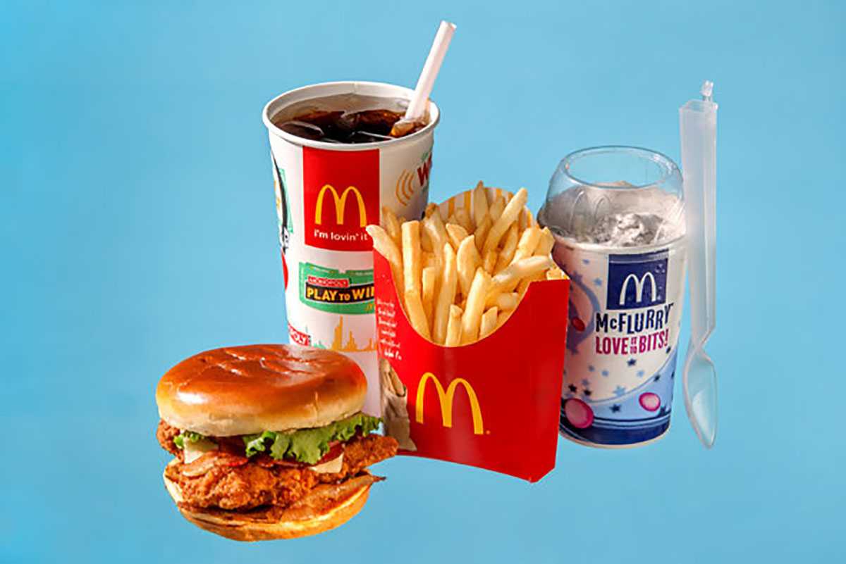 Состав: сэндвич с курицей и беконом (750 ккал); картофель-фри (340 ккал); обычная кола (200 ккал); десерт (690 ккал). Попытка заменить обычную колу на напиток с нулевым содержанием сахара сократит калорийность на 200 ккал — однако это совершенно не решает проблему избытка калорий в подобном наборе еды.