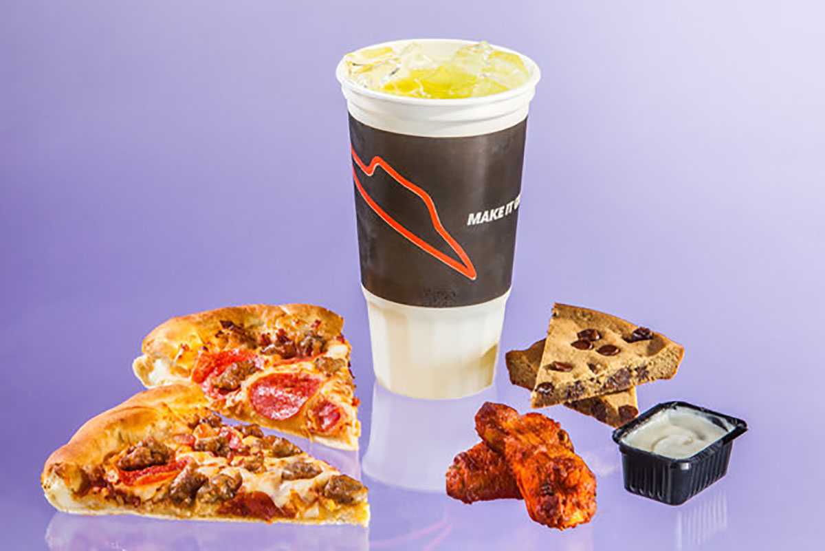 Состав: два куска пиццы с фаршем (880 ккал); куриные крылышки с сырным соусом (340 ккал); обычный спрайт (440 ккал); два кусочка печенья (360 ккал). Если вы думаете, что небольшой кусок пиццы физически не может содержать много калорий — попросите в ресторане быстрого питания таблицу энергетической ценности.