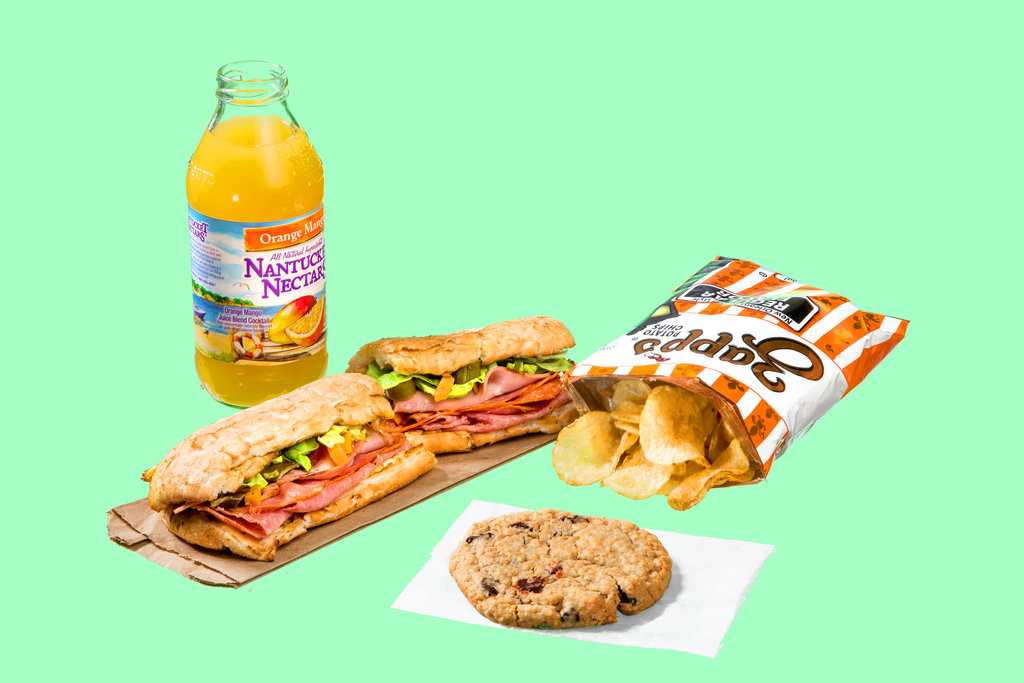 Состав: восстановленный фруктовый сок (250 ккал); большой сэндвич с колбасой, сыром и майонезом (1088 ккал); чипсы (220 ккал) и печенье (420 ккал). Хотя подобный набор продуктов выглядит как единичный прием пищи — но он содержит дневную норму калорий.