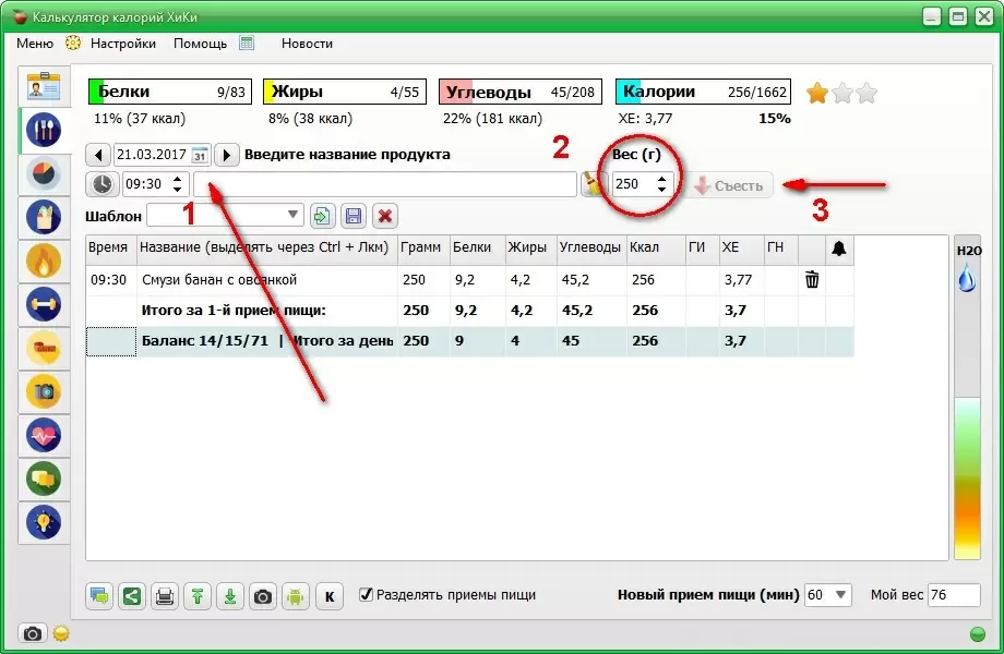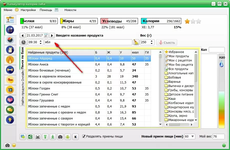 Удобно, что можно даже некоторые продукты не измерять на весах. Например, я часто пишу объем в столовых, чайных ложках, стаканах, или штуках (например, яблоко).