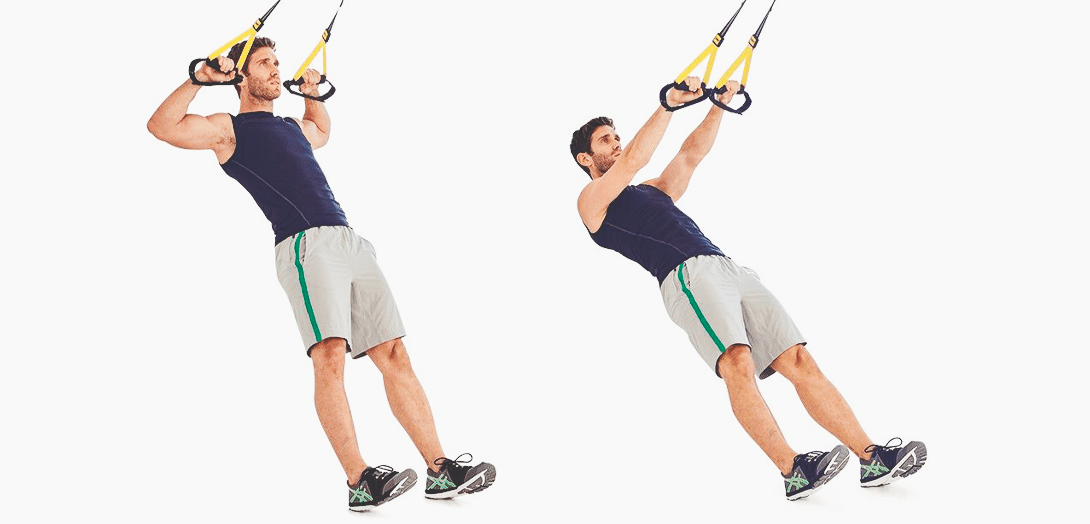 3. Подвесной тренинг — 5 подходов. Для выполнения этого упражнения закрепи пару подвесных ремней к устойчивой конструкции, встань лицом к ремням, напряги поясницу и корпус. Затем откинься назад так, чтобы ремни удерживали твой вес. Руки должны быть выпрямлены. Подтянись к ремням, сохраняя корпус напряжённым, а затем медленно опустись. При отсутствии ремней и возможности сходить в тренажёрный зал можно заменить это упражнение на подтягивания.