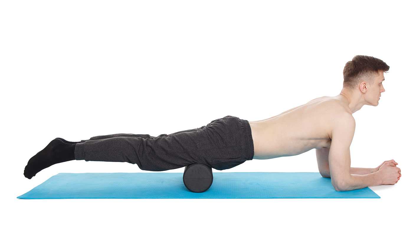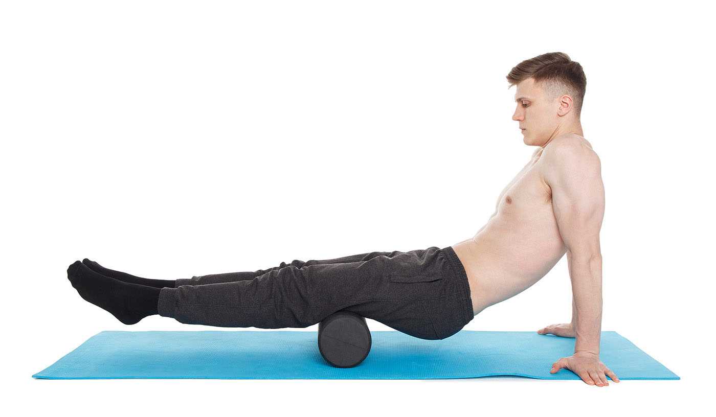 Расположите ролик под бедрами, опираясь на локти. Начните аккуратно перекатывать роллер вперед-назад, массируя мышцы. Избегайте чрезмерно резких движений, а также не создавайте давления на коленные суставы. Выполняйте упражнение 1-2 минуты.