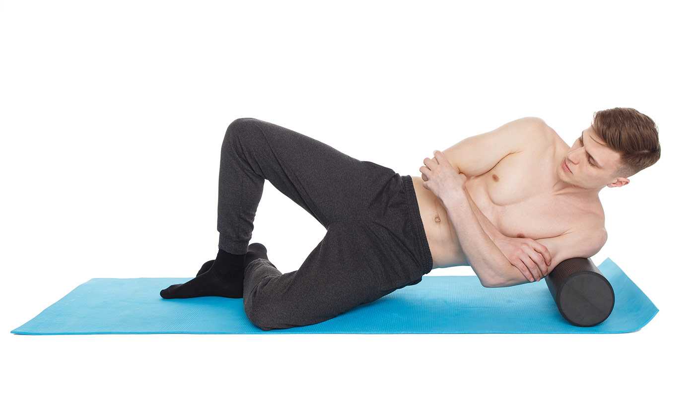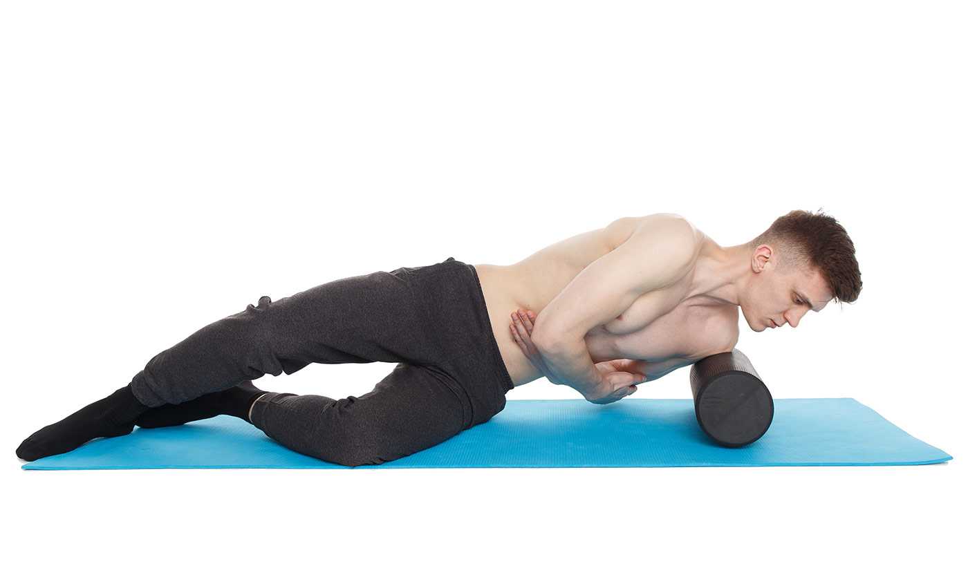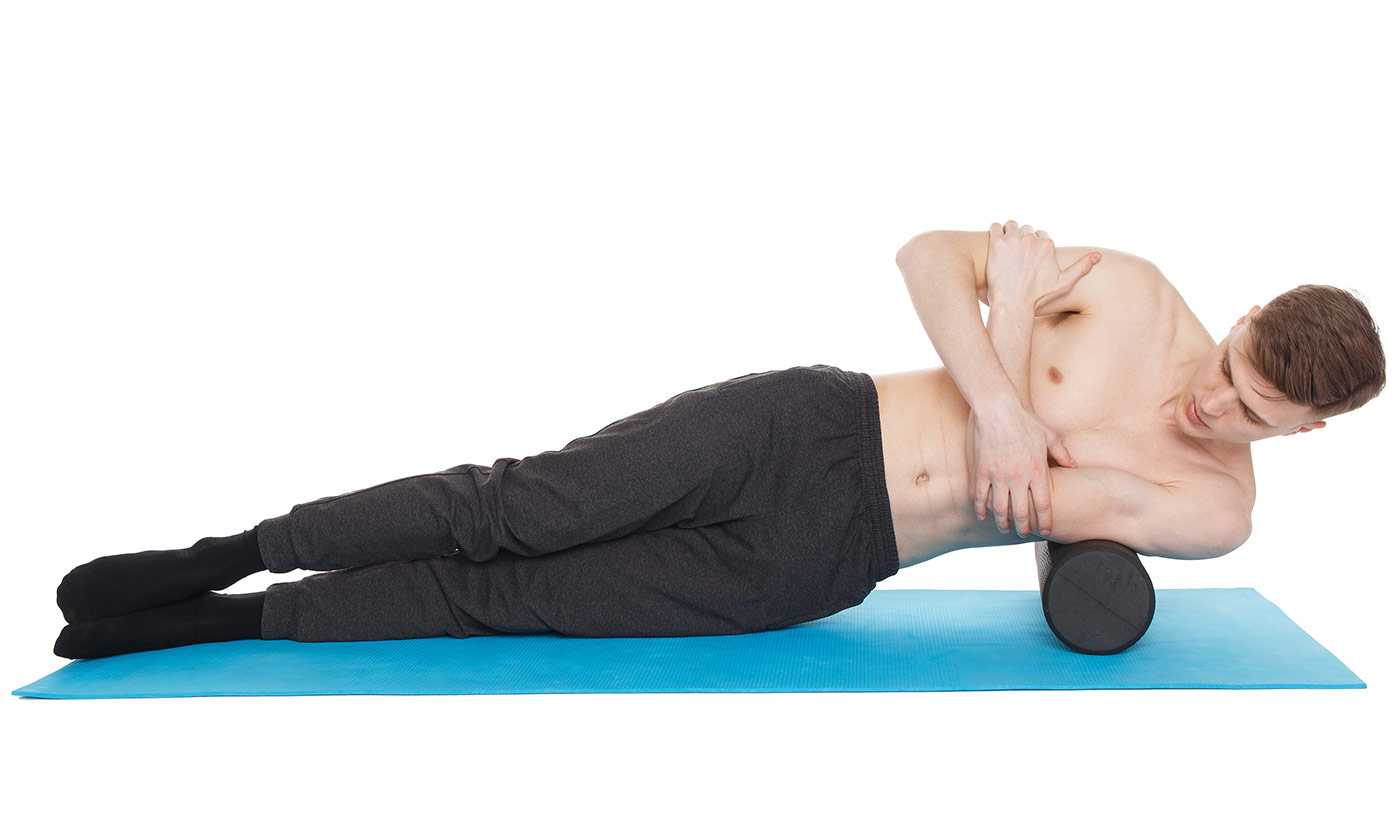 После того, как вы закончите массировать трицепс, переходить к области плеча — медленно прокатывайте ролик, контролируя уровень нагрузки и ища точки, в которых мышцы стянуты сильнее всего.