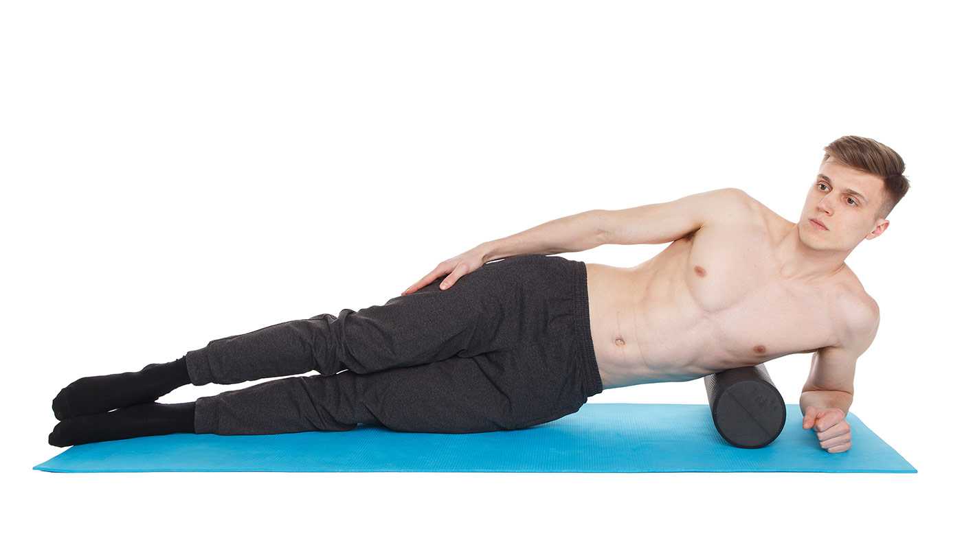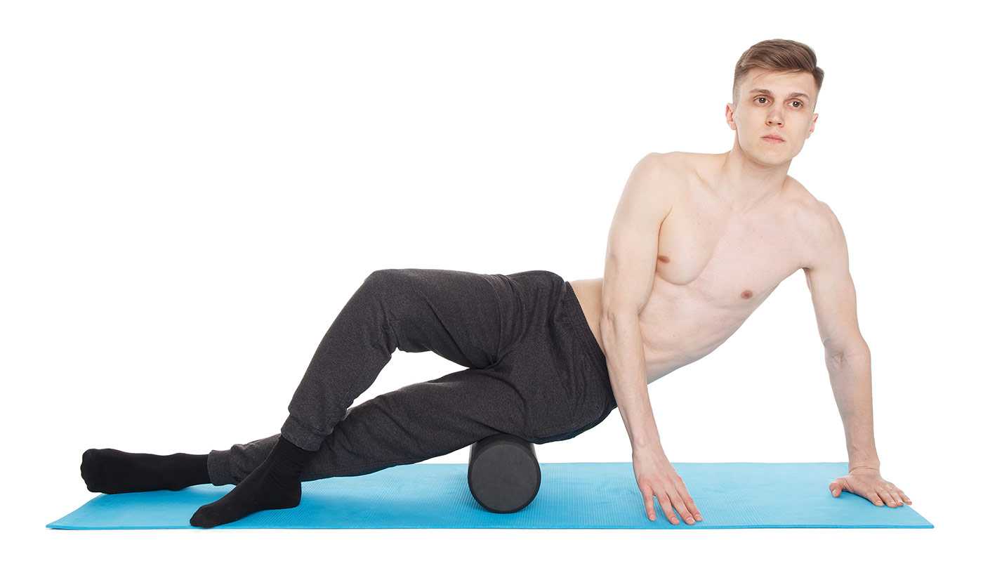 Лечь на бок; Роллер поместить под бедро; Ногу, лежащую на полу, поднять, опираясь на ладонь либо локоть; Перемещать роллер от таза к колену и обратно, пока не найдется точка. |